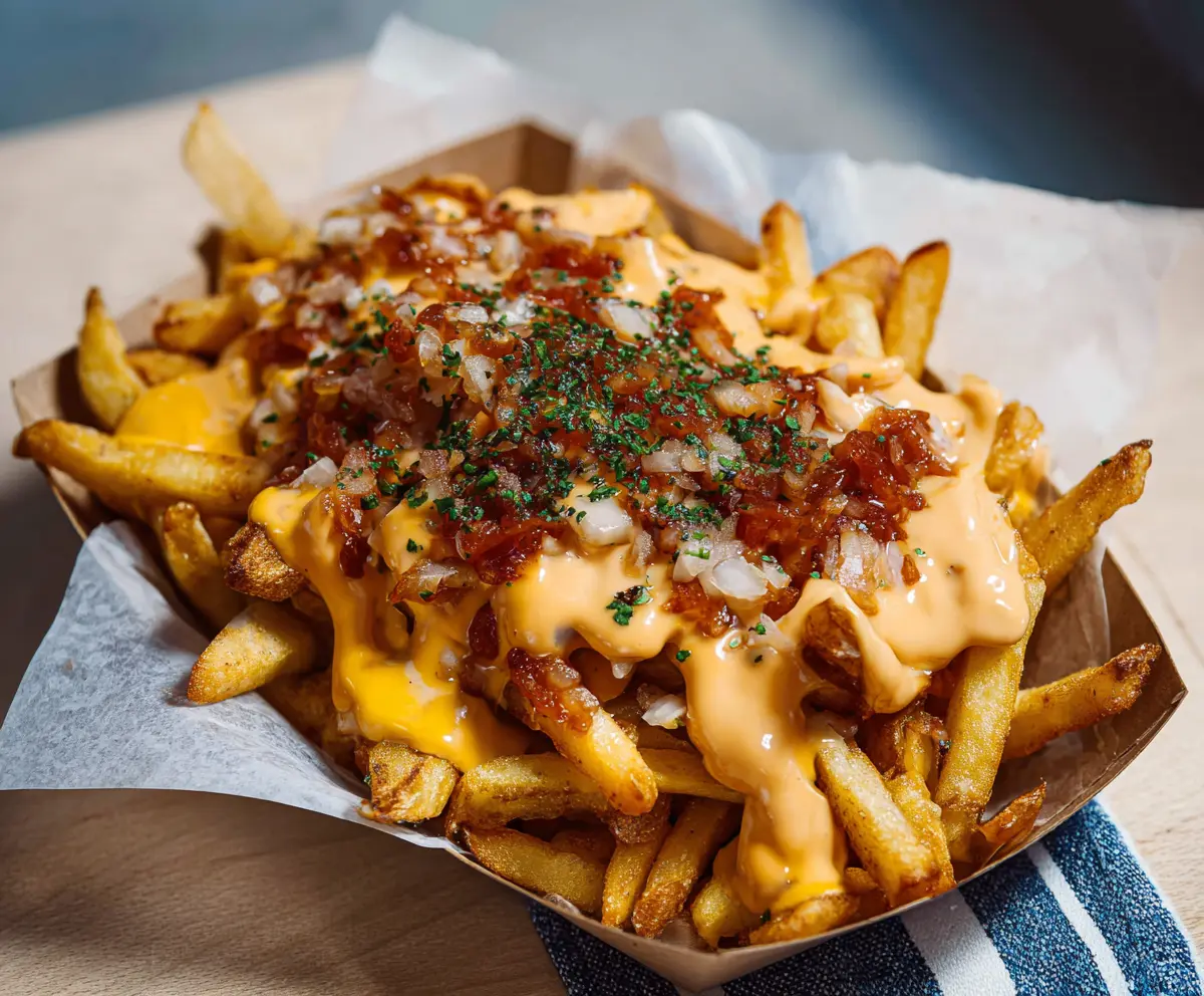 On a serving plate or tray, place the hot fries. Evenly layer the shredded cheese on top, allowing it to melt from the heat of the fries. Add a generous handful of the caramelized onions over the cheese, then drizzle the special sauce on top for that signature flavor. If you’d like, finish with a sprinkle of fresh parsley or chives for a pop of color!