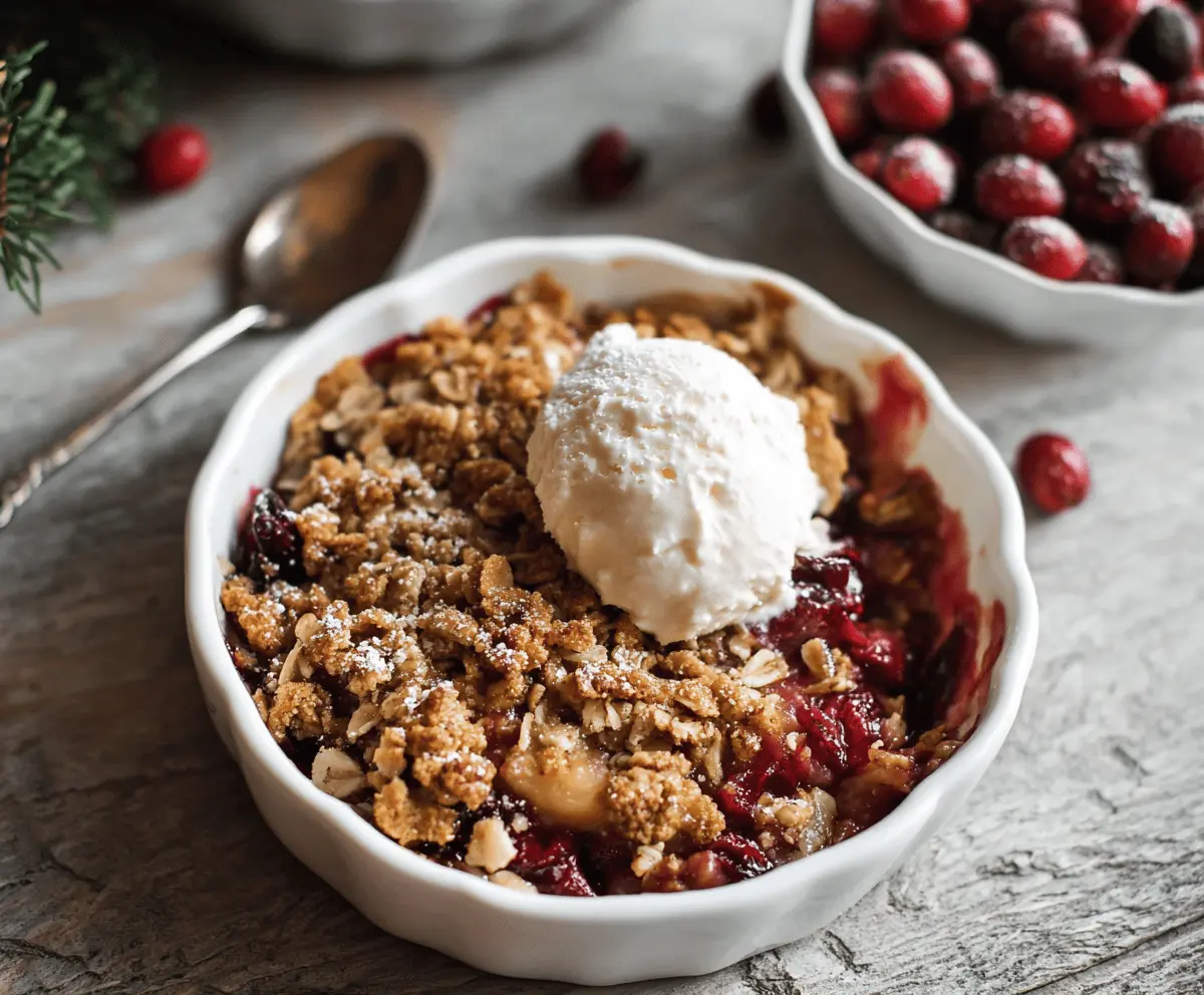 This Apple Cranberry Crisp is a warm, cozy dessert that combines sweet apples and tart cranberries, topped with a crunchy oat and brown sugar mixture. Perfect for fall!