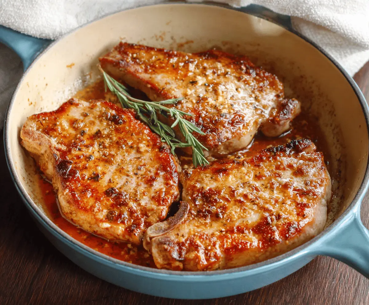 Heat the olive oil in an oven-safe skillet or cast-iron pan over medium-high heat. Once the oil is hot and shimmering, add the pork chops to the pan, ensuring not to crowd them.
