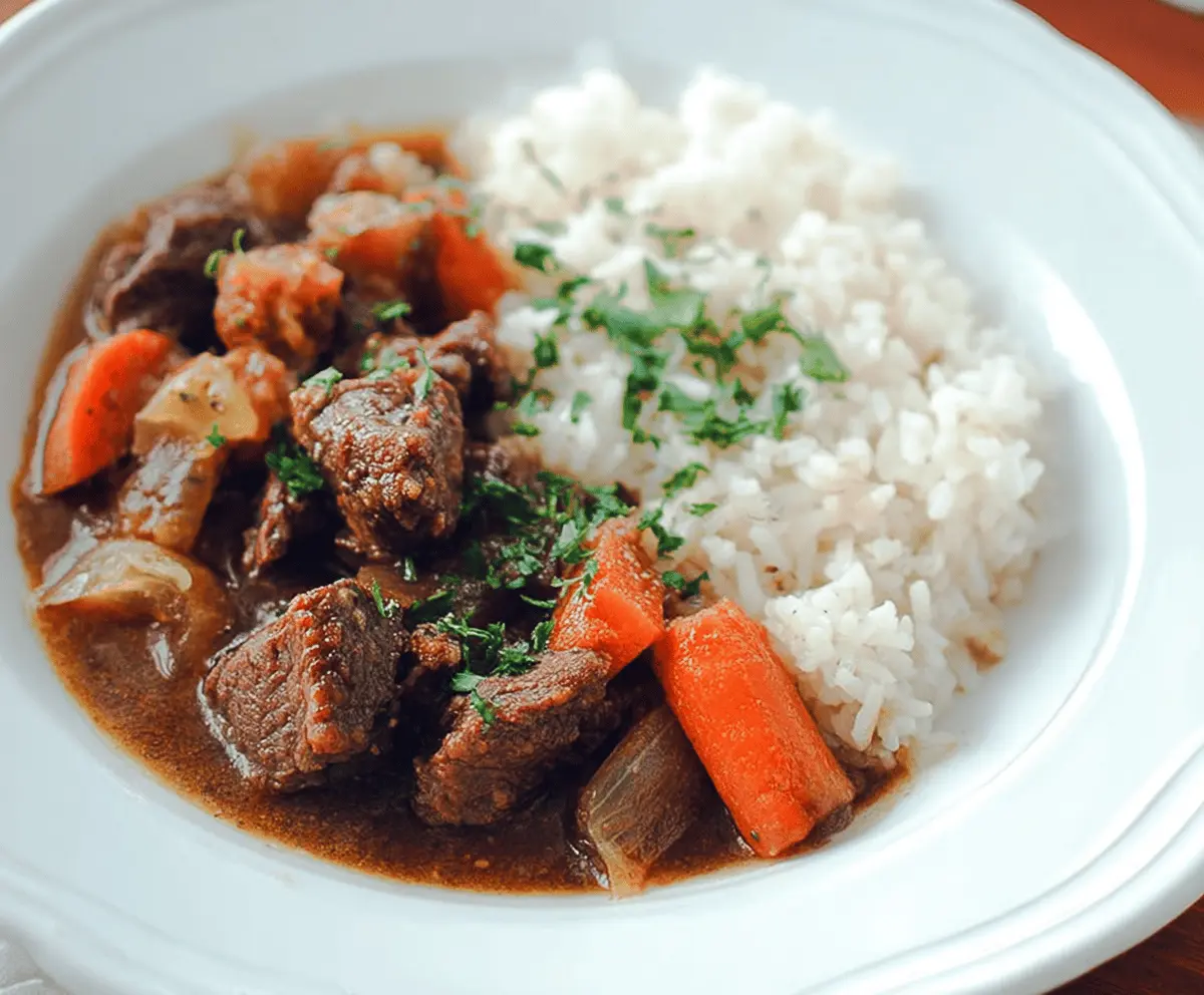 Serve the beef stew hot over a bed of fluffy rice. Garnish with freshly chopped parsley and, if desired, a sprig of fresh rosemary for that extra touch. Enjoy this cozy, flavorful beef stew with rice—it’s a perfect meal for any occasion!
