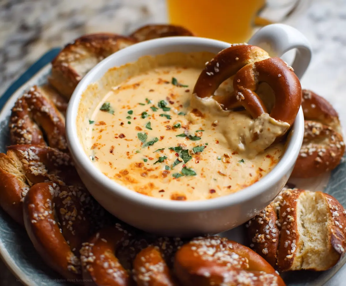 Serve your dip immediately with warm soft pretzels or crunchy crackers. Gather your friends and enjoy this creamy, cheesy delight!