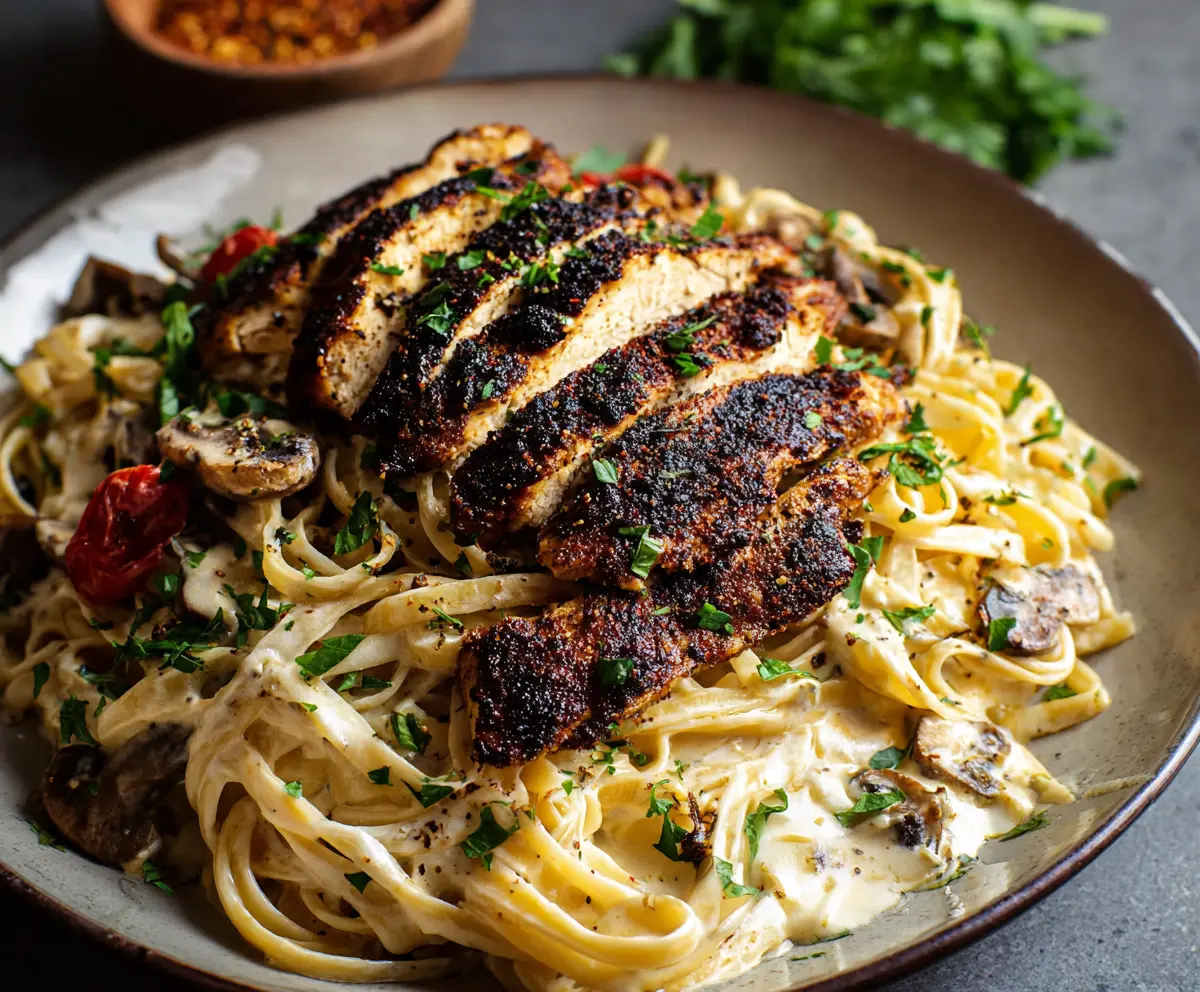 Serve the creamy pasta on plates or in bowls. Top with the sliced blackened chicken, and finish with a sprinkle of fresh basil or parsley for a pop of color and flavor!