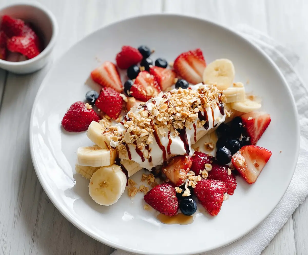 This Breakfast Banana Split is a fun twist on a classic. It features a banana split in half, topped with yogurt, fresh fruits, and a sprinkle of granola. Perfect for starting the day sweetly!