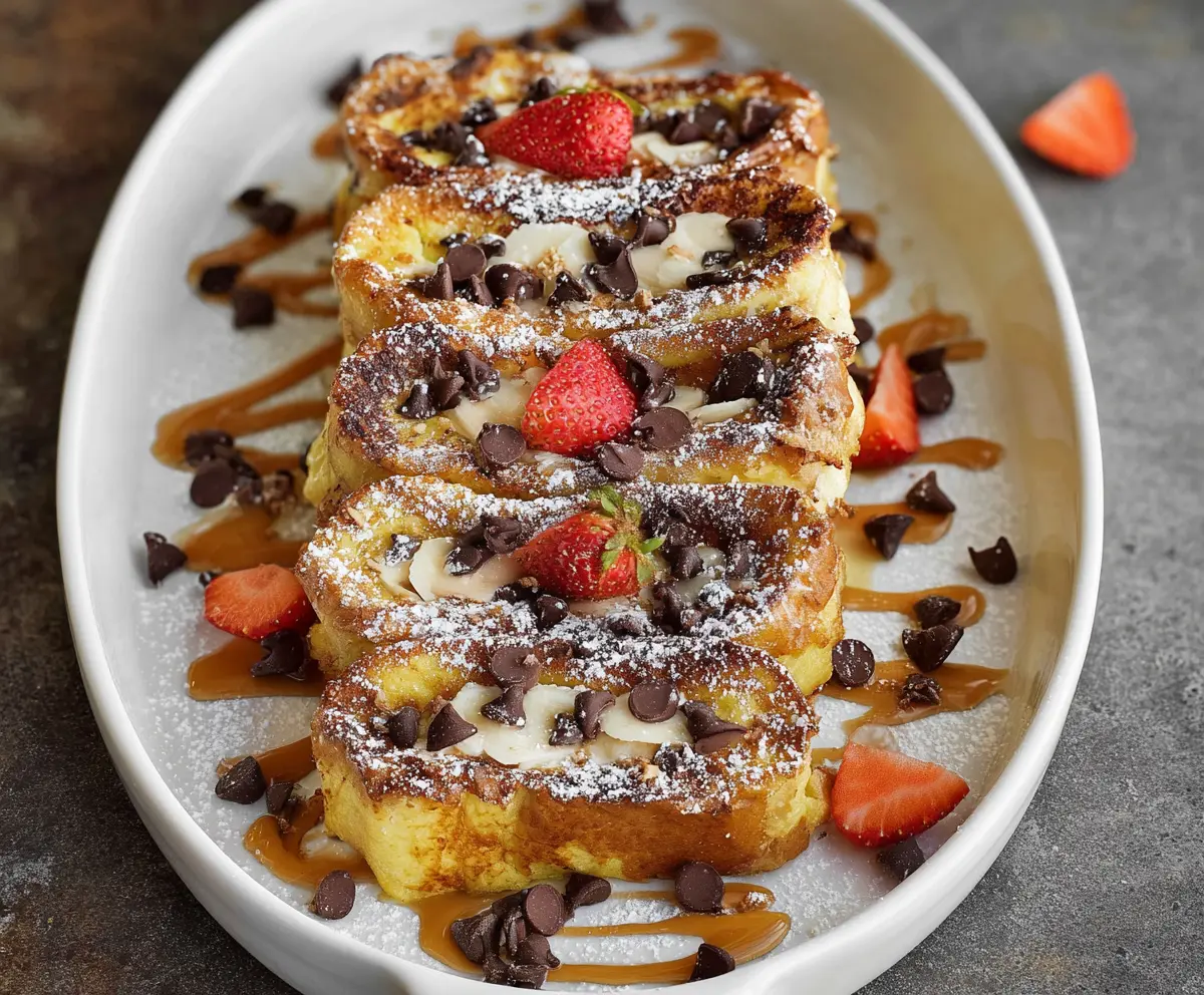 Once cooked, transfer the French toast to a serving plate. Dust with powdered sugar and sprinkle some extra mini chocolate chips on top.