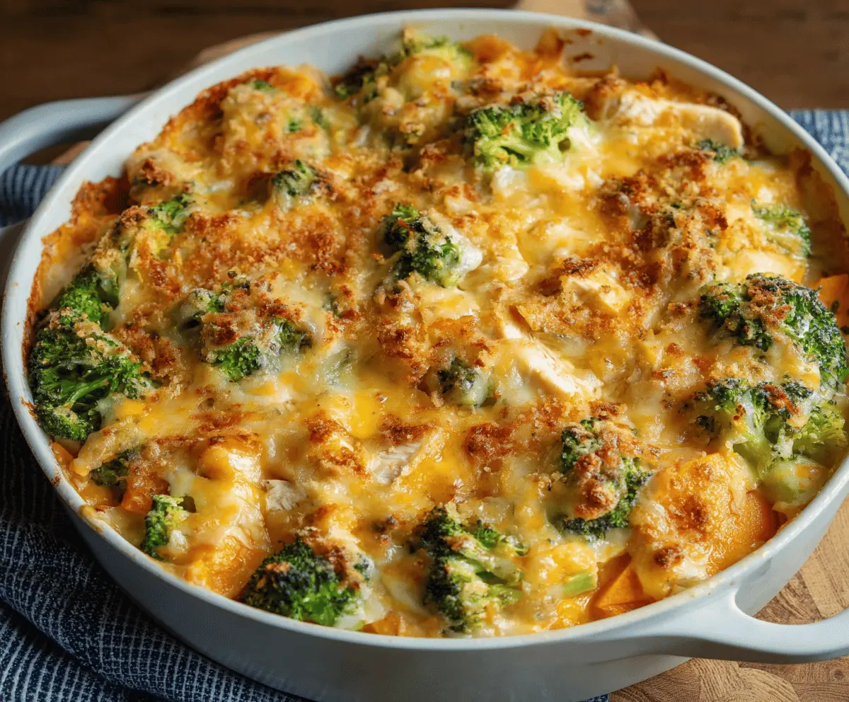 Cheesy Chicken Sweet Potato Broccoli Casserole