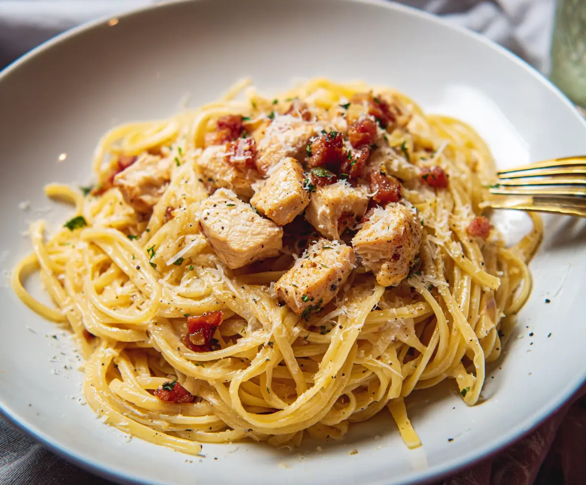 Plate the pasta immediately, garnishing with the remaining Parmesan cheese and a sprinkle of fresh parsley. Enjoy your creamy Chicken Carbonara Pasta!