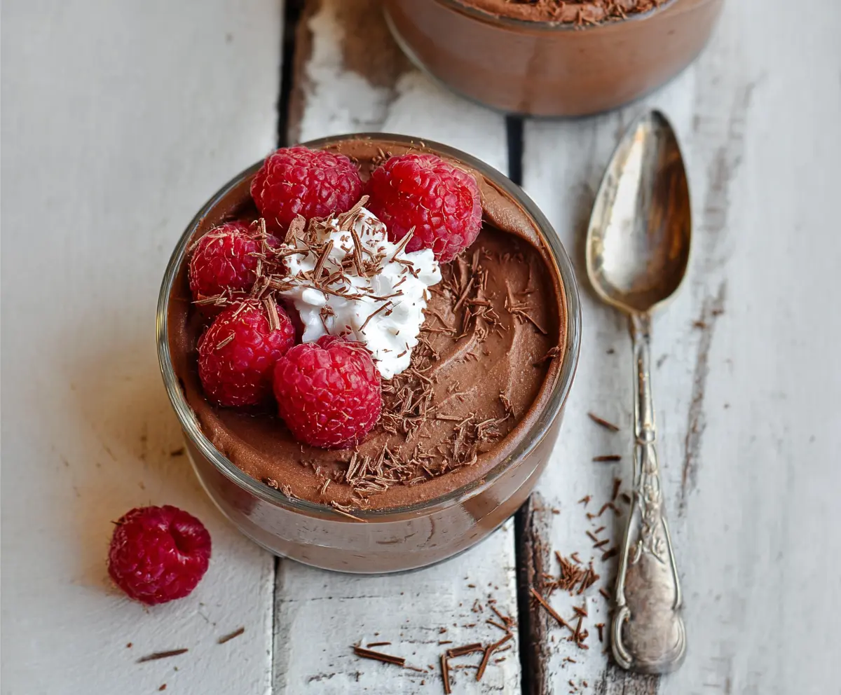 Before enjoying, top your mousse with fresh raspberries and blueberries. Sprinkle some shaved dark chocolate and shredded coconut for an extra wow factor!