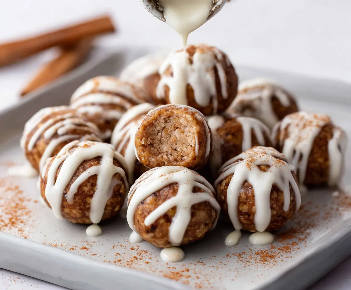 While the bites chill, it’s time to make the icing! In a separate bowl, mix together the cream cheese (or Greek yogurt), honey (or maple syrup), vanilla extract, and a splash of milk or water until the icing is smooth and drizzly.