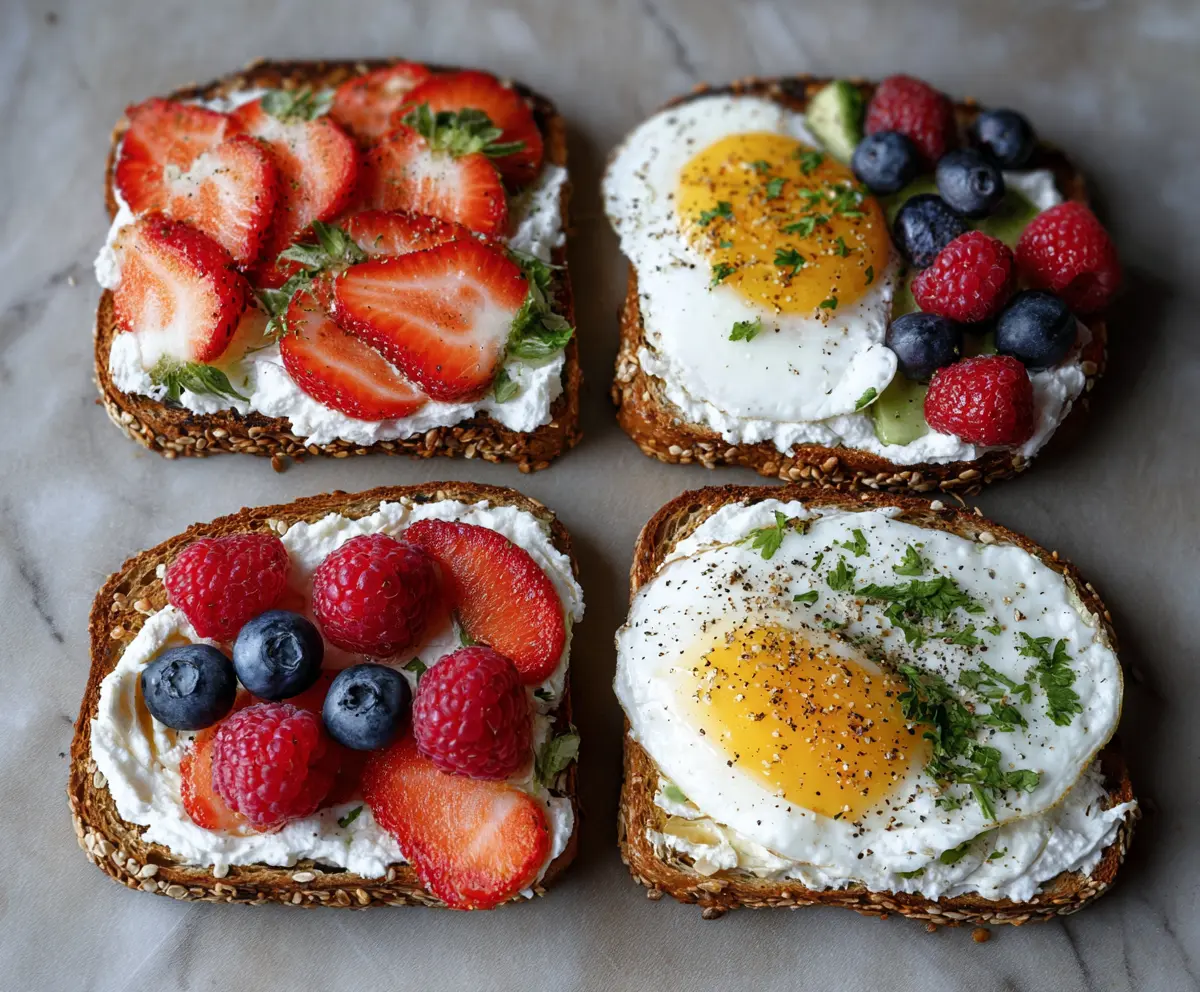 Now all your toasts are ready! Arrange the four colorful toasts together on a plate for a beautiful breakfast spread. Enjoy your Cottage Cheese Breakfast Toast, packed with fresh fruits, creamy cheese, and protein-rich eggs!
