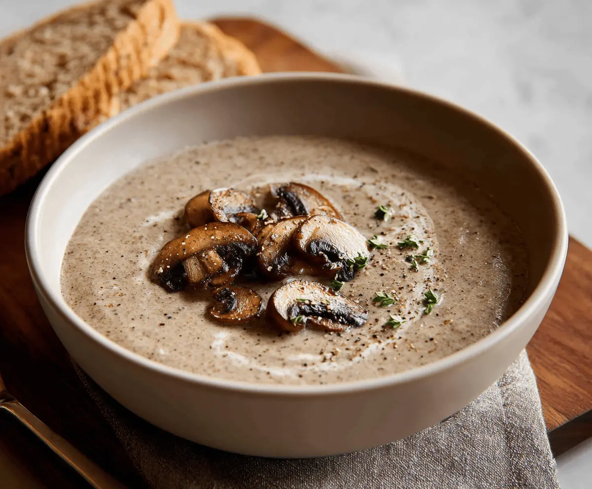 Ladle the soup into bowls and, if you like, garnish with additional sautéed mushroom slices and fresh thyme sprigs for a beautiful touch. Serve hot, and enjoy every creamy spoonful of this comforting soup!