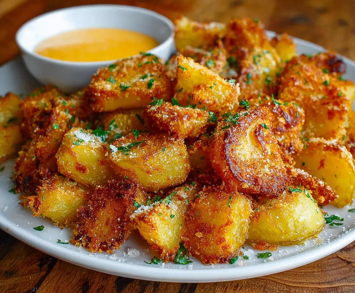 For the finishing touches, serve your crispy Parmesan potatoes hot. Pair them with your favorite dipping sauce, like spicy mayo or garlic aioli if you like. Enjoy your cheesy, crunchy delight!