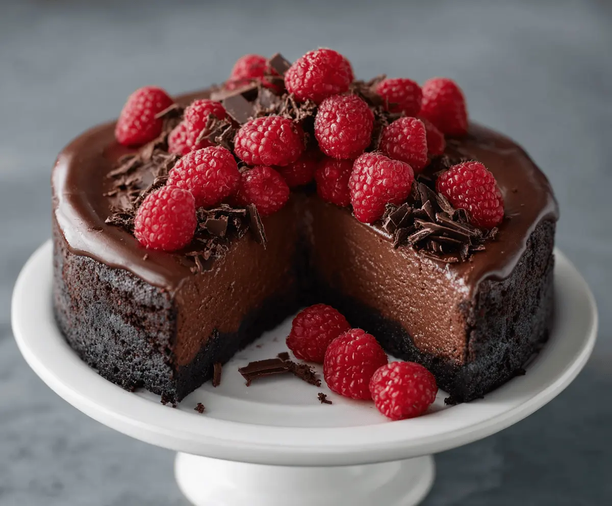 This rich dark chocolate raspberry cheesecake is a tasty treat! The creamy filling and tart raspberries complement the chocolate perfectly, making every bite delightful.