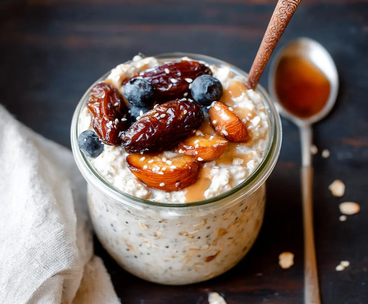 This recipe perfectly combines the natural sweetness of dates with the rich, nutty flavor of tahini, making it a wholesome and delightful overnight oat breakfast!