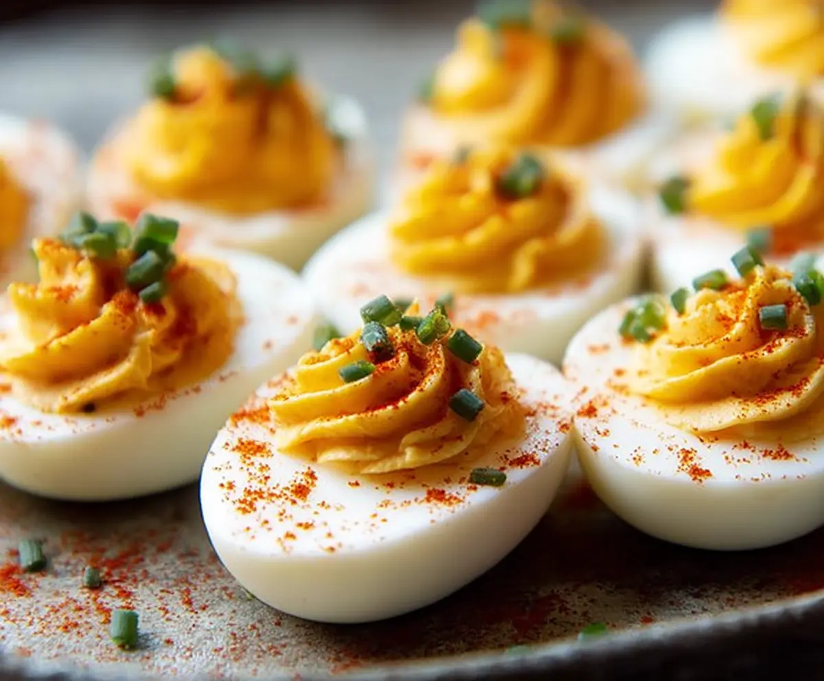 Deviled eggs are a classic snack that everyone loves! They are hard-boiled eggs filled with a tasty mix of yolk, mayonnaise, and a dash of mustard.