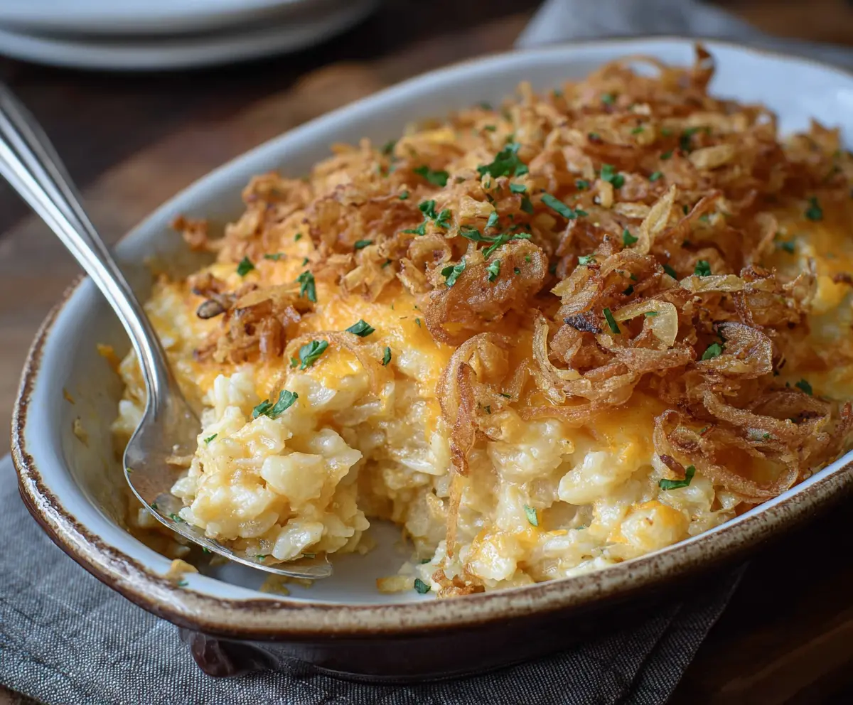 This dish beautifully combines the creamy goodness of funeral potatoes with the rich taste of French onion soup, all topped off with crunchy fried onions. Your friends and family will love it!