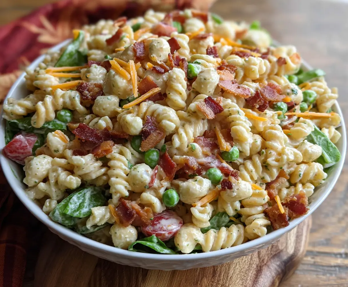 This pasta salad is a fun mix of fresh veggies, creamy ranch dressing, and crispy bacon. It’s colorful, tasty, and perfect for any gathering!