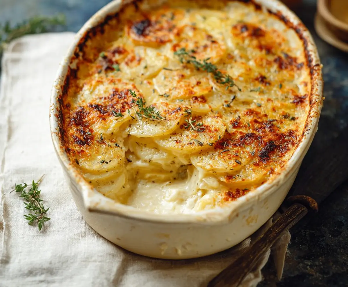 Finally, garnish your creamy potato gratin with some fresh thyme leaves. Serve it warm as a delicious and cheesy side dish that’s sure to impress!