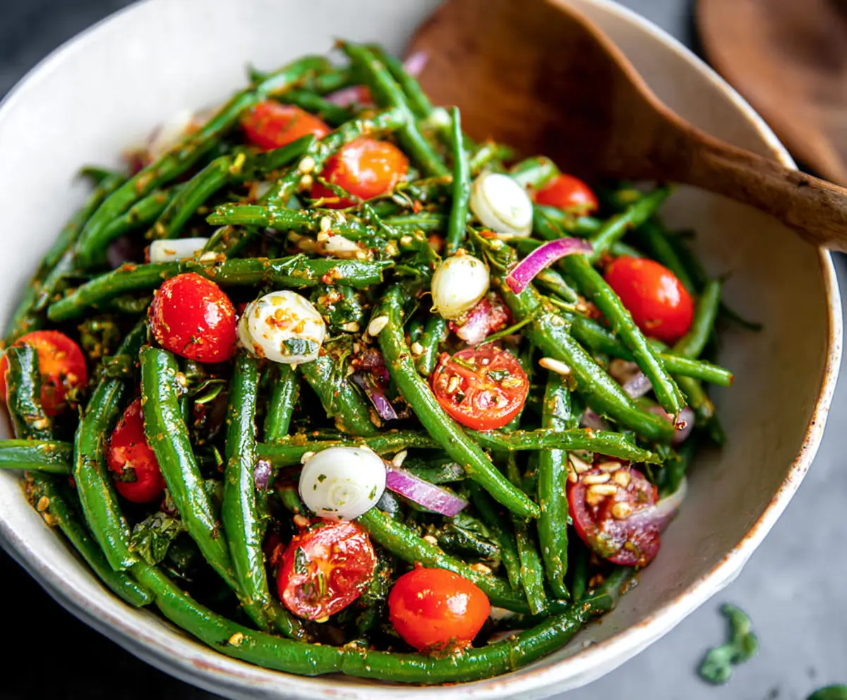 In a large salad bowl, mix together the green beans, halved cherry tomatoes, mozzarella balls, and sliced red onion. Give it a gentle stir to combine.