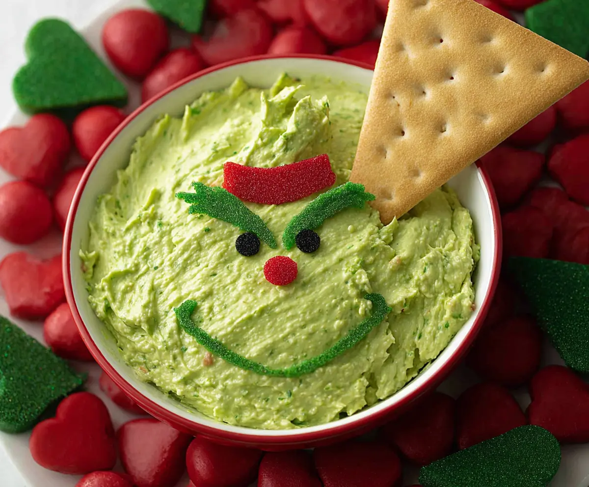 For a final touch, insert a triangular cracker or chip into the side of the dip as if it’s the Grinch’s cute little hat—this adds a fun twist!
