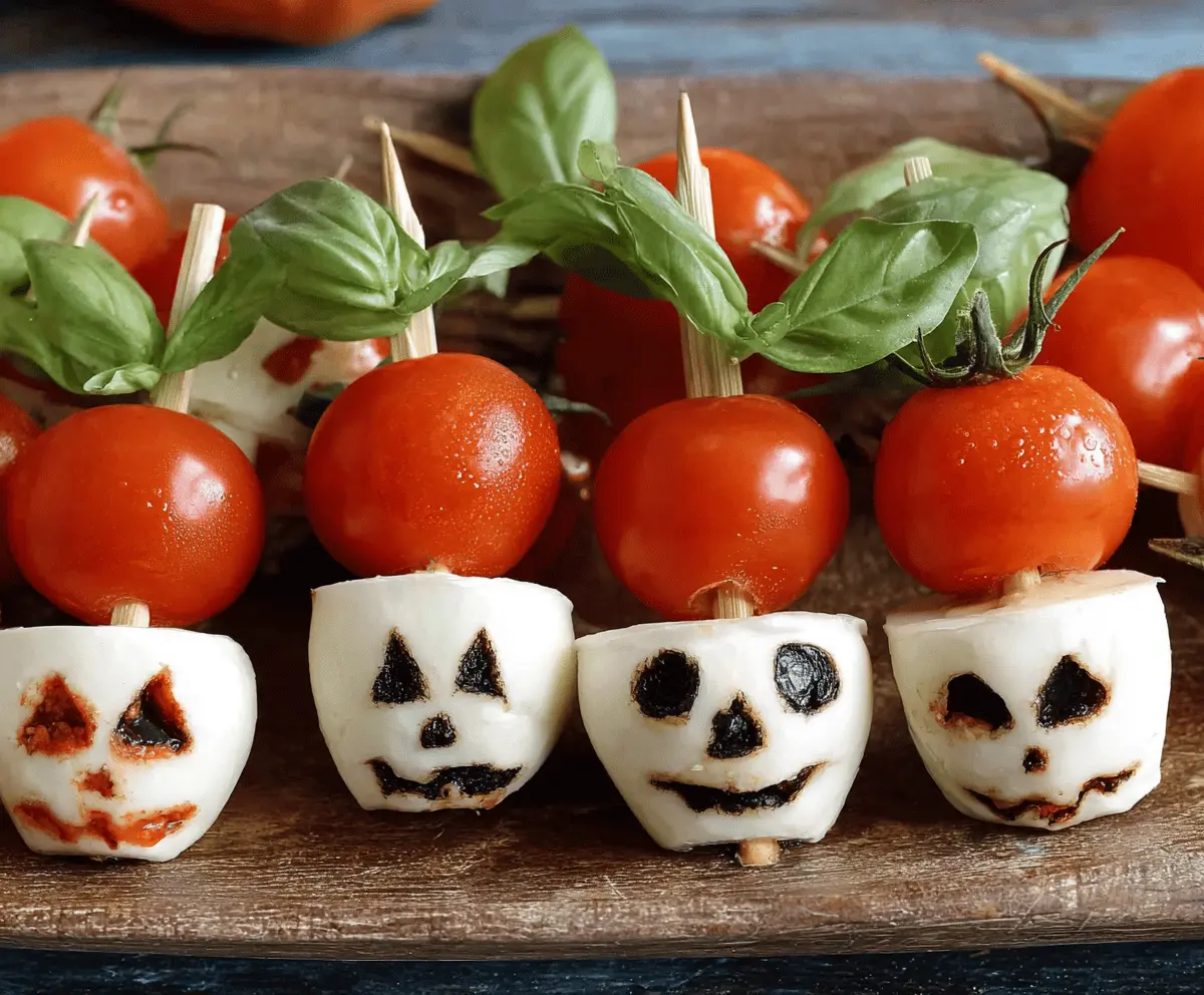 Halloween Caprese Skewers are a fun twist on the classic salad! Stack fresh mozzarella, juicy cherry tomatoes, and basil leaves on sticks for a spooky and tasty treat.