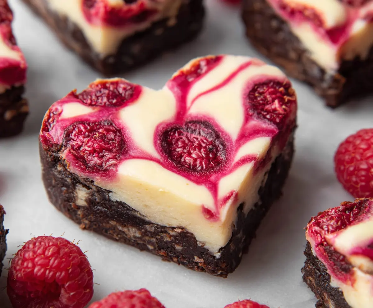 These brownies combine the fudgy texture of classic brownies with creamy cheesecake and the fresh tartness of raspberry — a delightful treat presented in charming heart shapes!