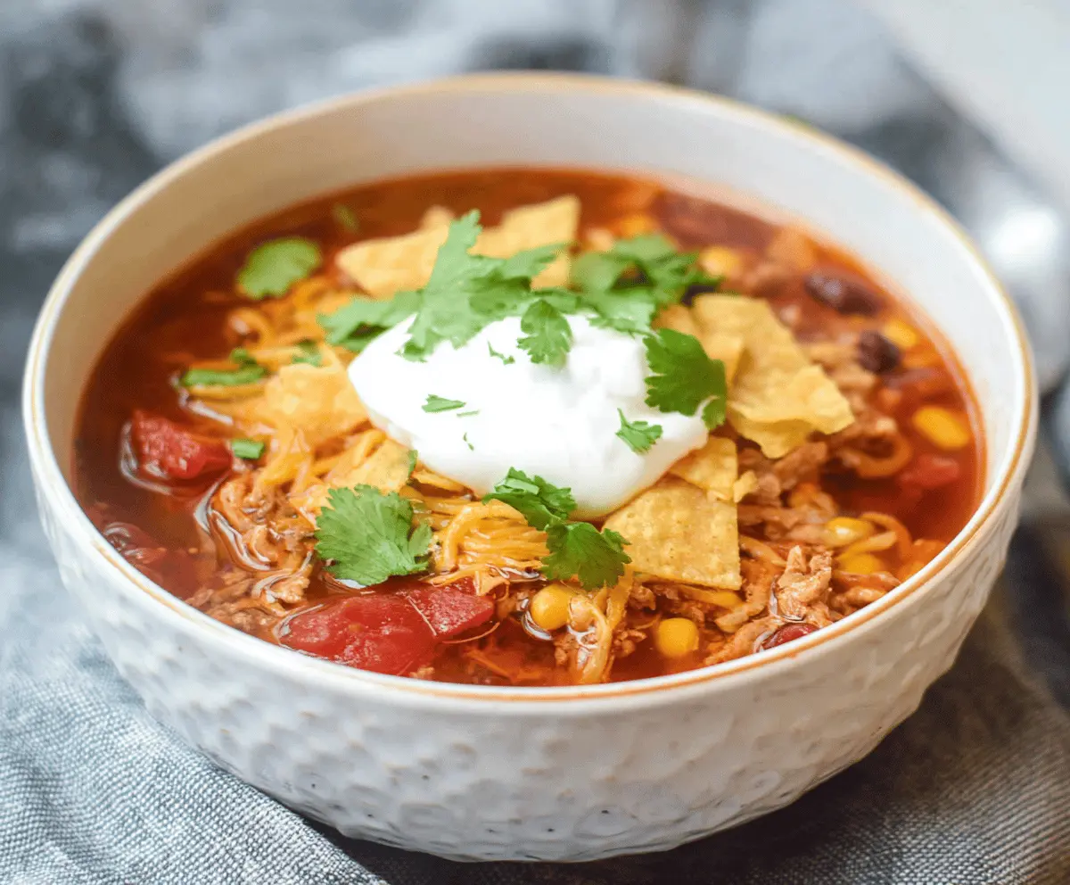 Ladle the soup into bowls and top each serving with a sprinkle of shredded cheddar cheese, a dollop of sour cream, some extra crushed tortilla chips for crunch, and a sprinkle of fresh cilantro to bring it all together.