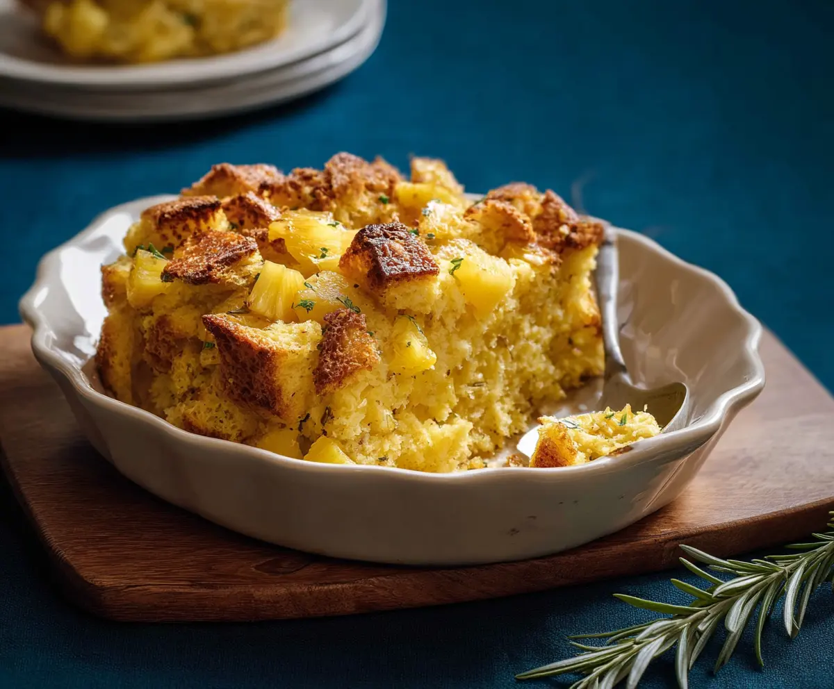 This Pineapple Stuffing is a fun and sweet twist on a classic side dish! With bits of juicy pineapple mixed into soft bread, it’s both tasty and easy to make.