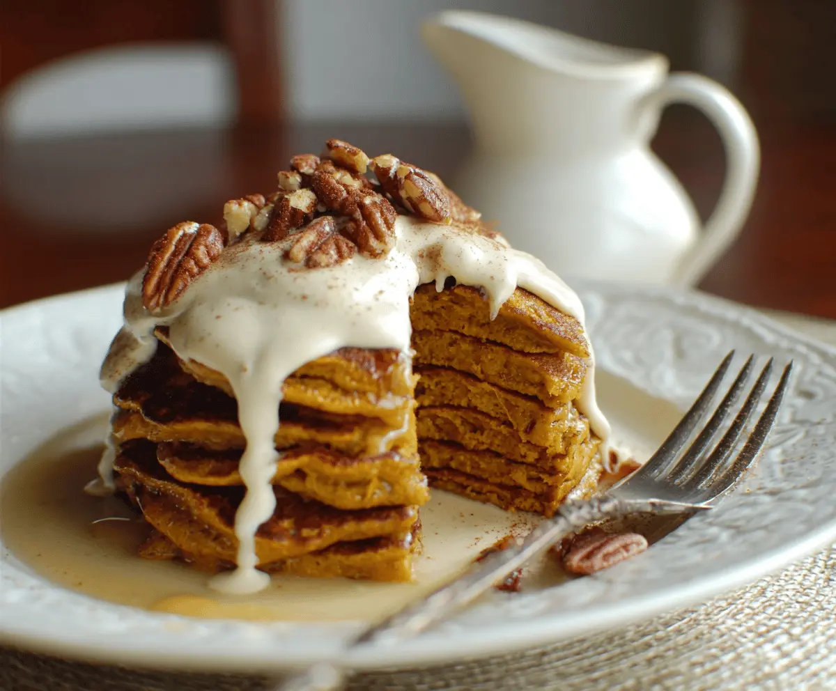 Stack your fluffy pancakes on a plate, and top them with any remaining cream cheese mixture if you like. Drizzle with maple syrup and sprinkle with chopped pecans for a delightful finish. Enjoy your cozy feast of Pumpkin Cream Cheese Pancakes, perfect for any fall morning!
