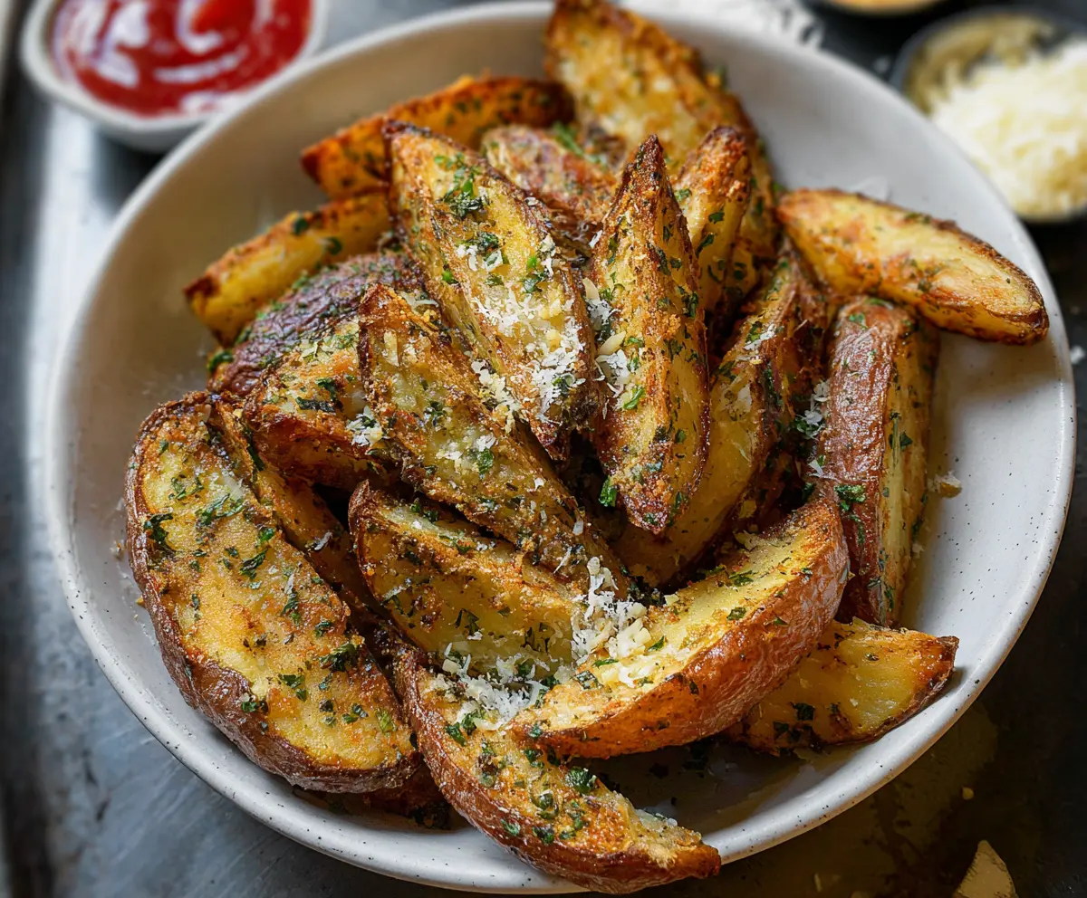 Enjoy these crispy, cheesy, and garlicky potato wedges as a delightful side dish or snack anytime!