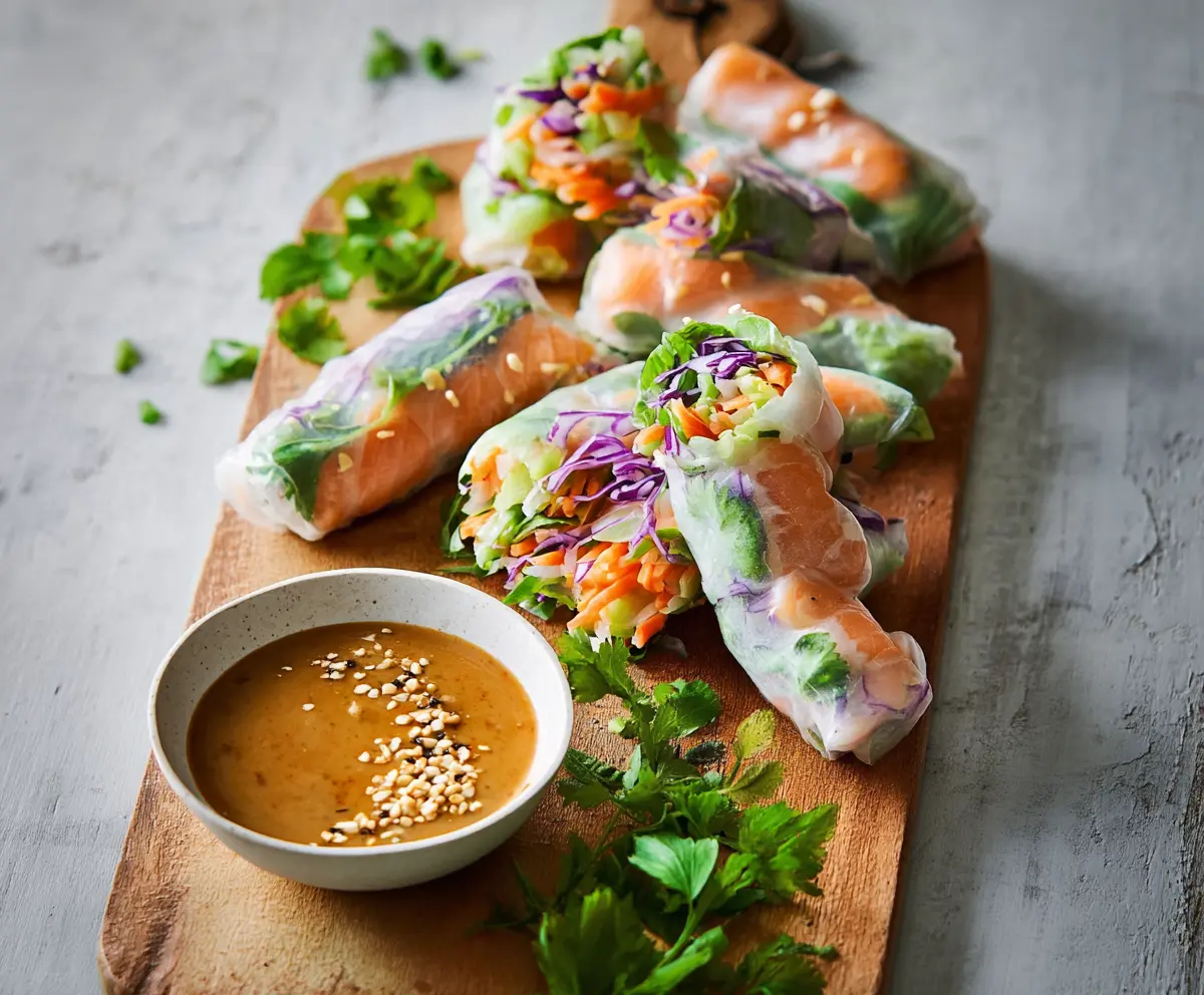 Enjoy your fresh, vibrant Salmon Spring Rolls with creamy, savory peanut sauce!