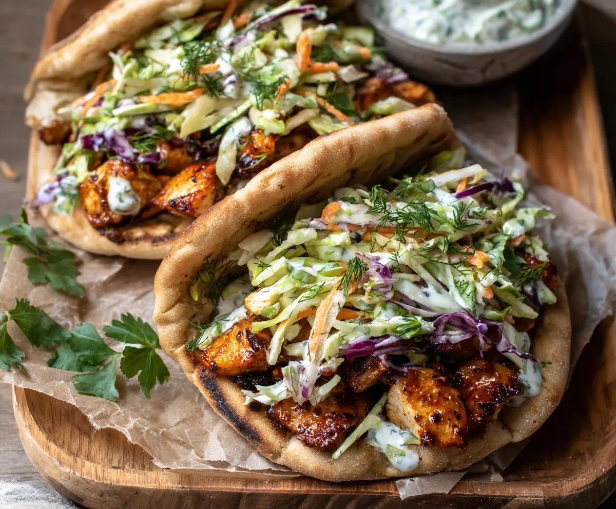 This recipe combines tender, spiced baked chicken with a creamy, herbaceous cabbage slaw inside soft pita bread for a flavorful, satisfying meal. Enjoy every bite!