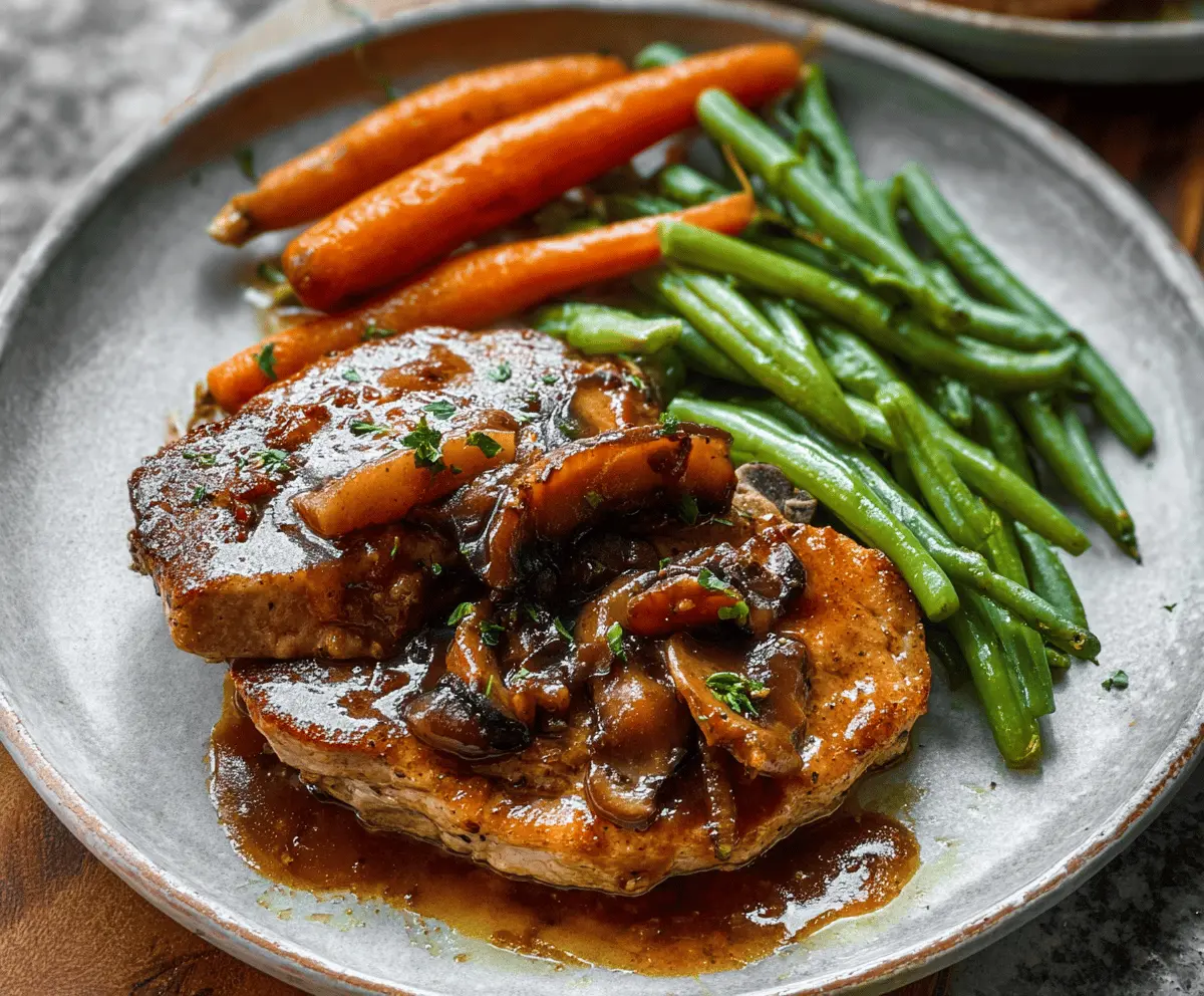 Serve the pork chops hot, topped with the mushroom-onion sauce. Garnish with fresh parsley or thyme and lemon slices for a bright touch.