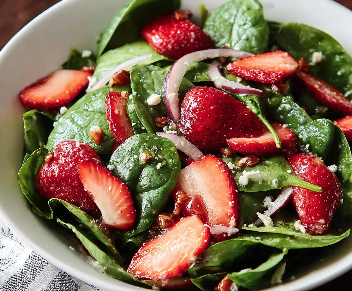 You can prepare the components ahead of time! Wash and slice the spinach and strawberries, and store them separately. Make the dressing and keep it in a jar. Combine everything right before serving to keep the salad fresh and vibrant.