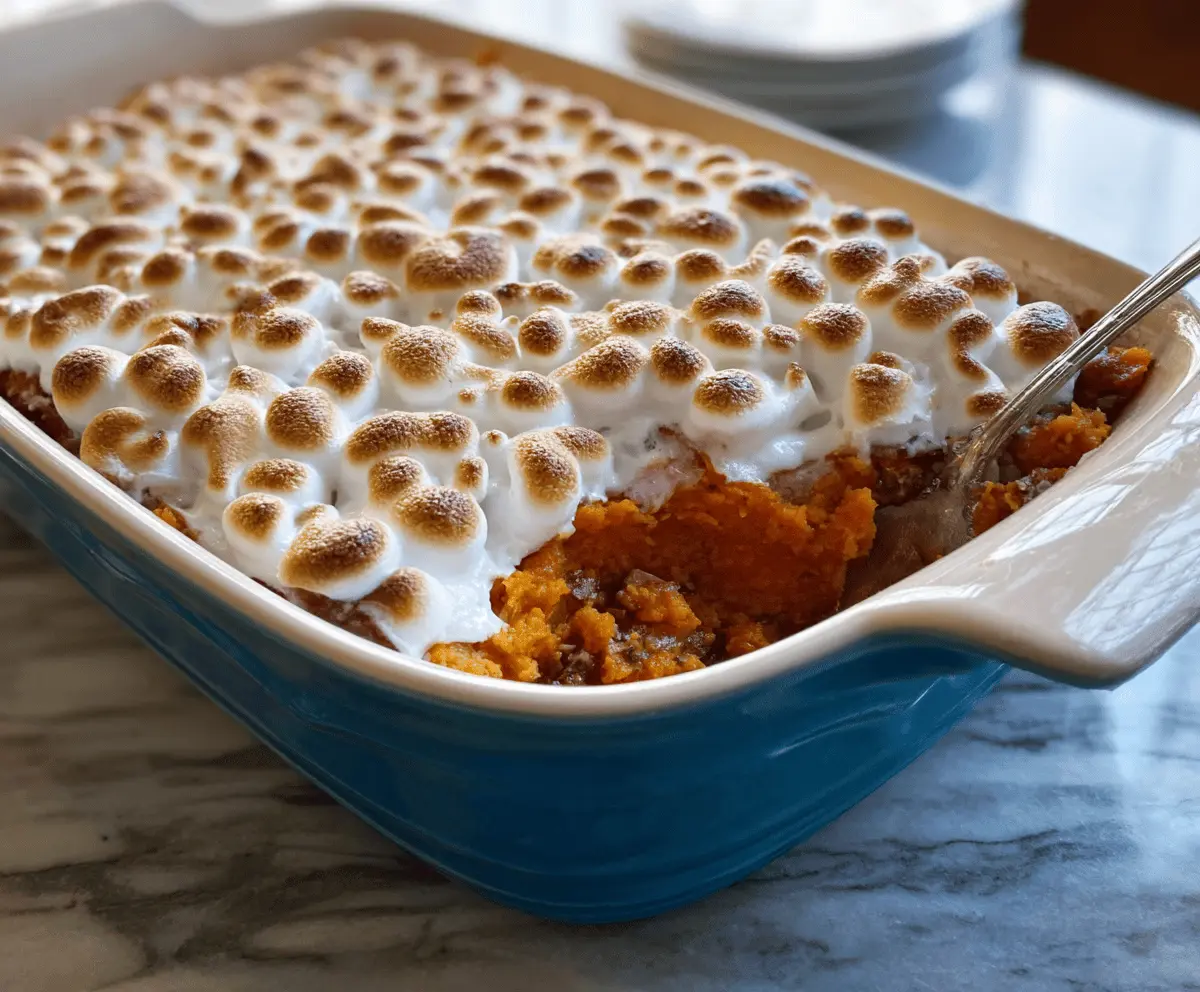Sweet Potato Casserole with Marshmallow and Pecan Topping