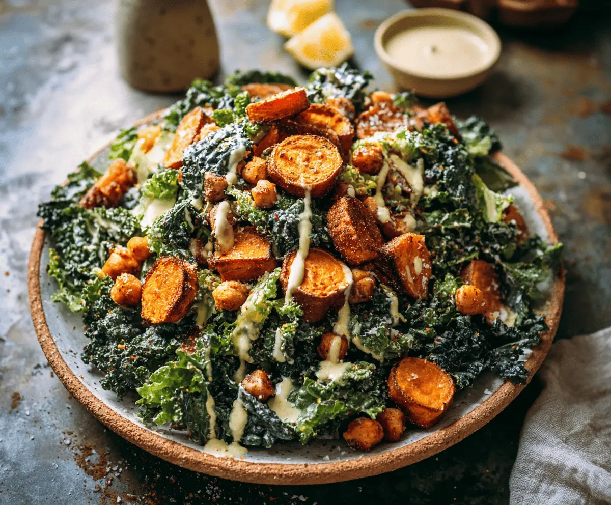 This Sweet Potato Kale Caesar Salad is a yummy twist on the classic. It’s packed with crispy kale, roasted sweet potatoes, and a creamy dressing that brings it all together.