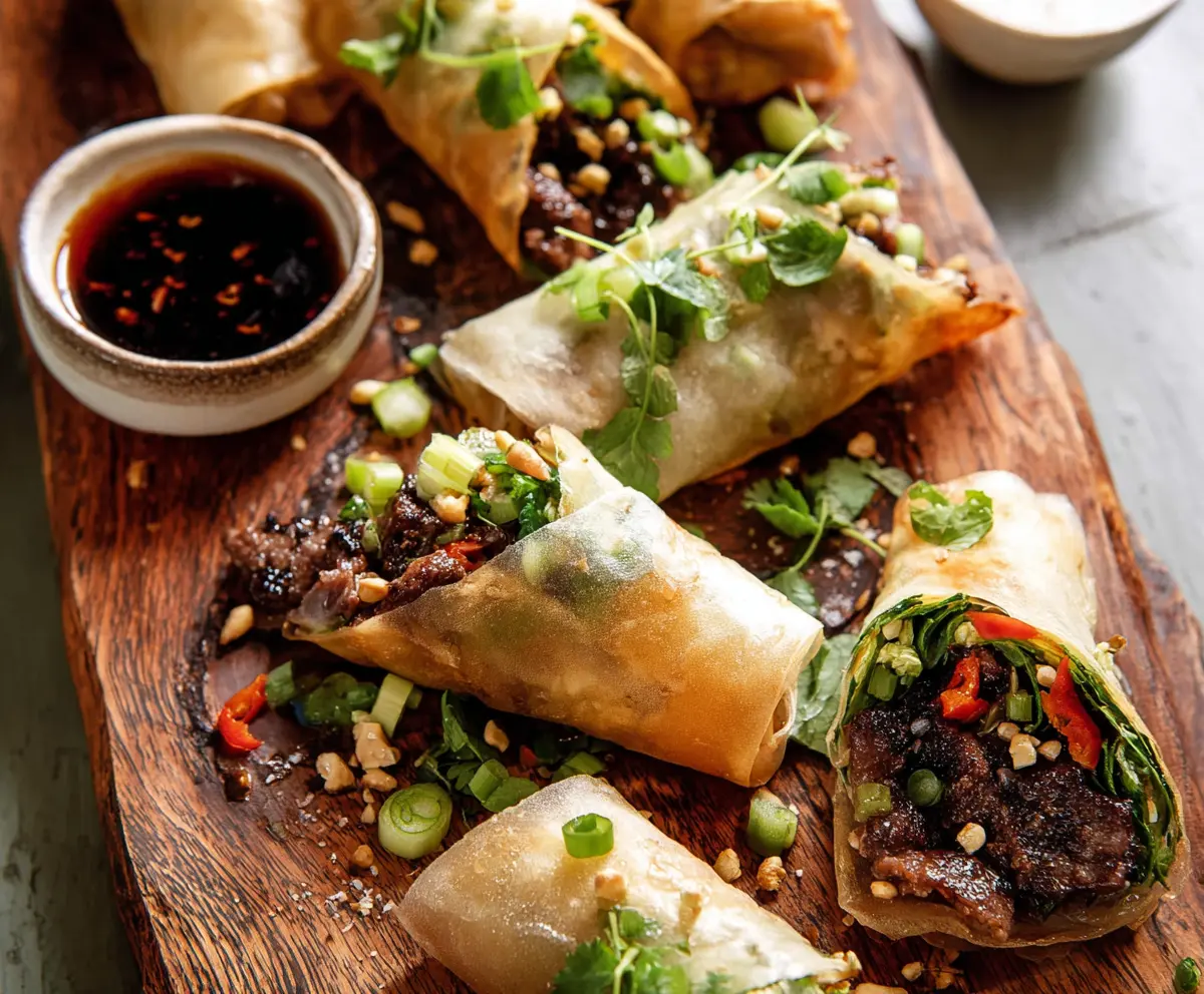 Your Thai beef spring rolls are ready to be served! Arrange them on a platter and pour the dipping sauce into a small bowl for easy dipping. Enjoy them fresh as a delightful appetizer or a light meal. Bon appétit!