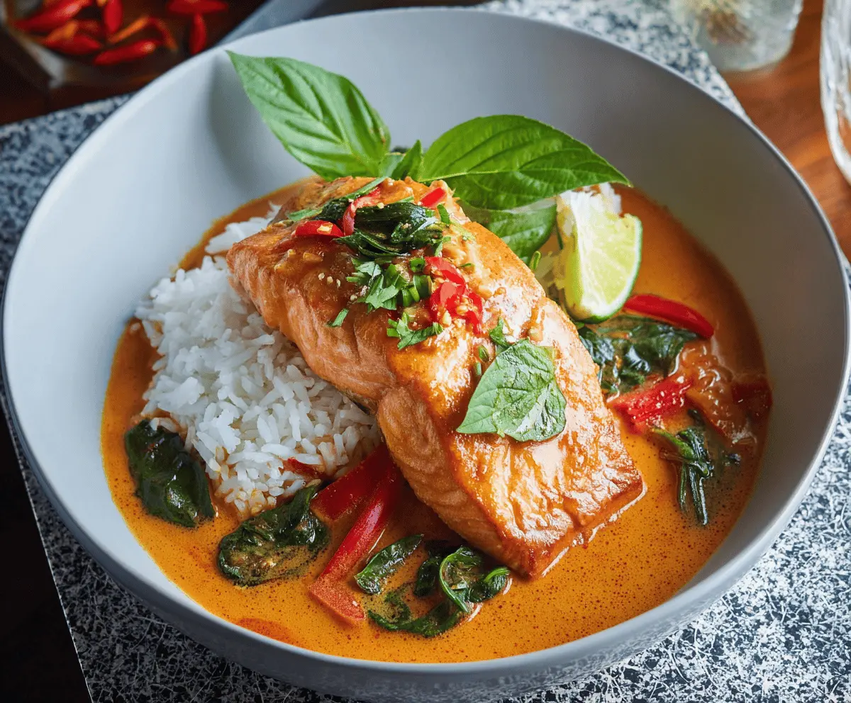 Serve the salmon and the rich curry sauce over cooked jasmine rice. Top with extra fresh basil leaves and lime wedges on the side for squeezing over. Enjoy this delicious and colorful dish!