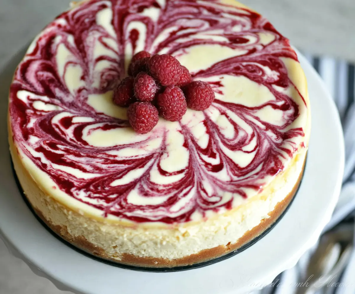 This cheesecake combines creamy white chocolate and sweet-tart raspberry for a delightful dessert that’s perfect for any occasion. Enjoy! 🍰